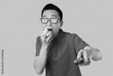 Emotional young Asian man with remote controller and popcorn watching TV on grey background