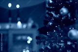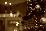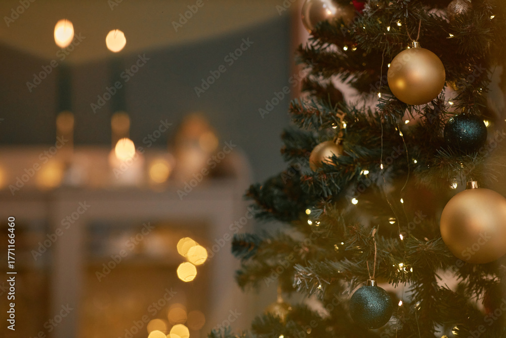 Christmas tree decorated with gold and dark ornaments standing indoors with string lights glowing, blurred background showing warm lights and festive atmosphere, no people visible