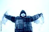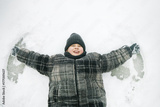 Caucasian child lying on snow making snow angel, smiling with arms outstretched, wearing winter clothing, looking up with joyful expression, winter outdoor activity