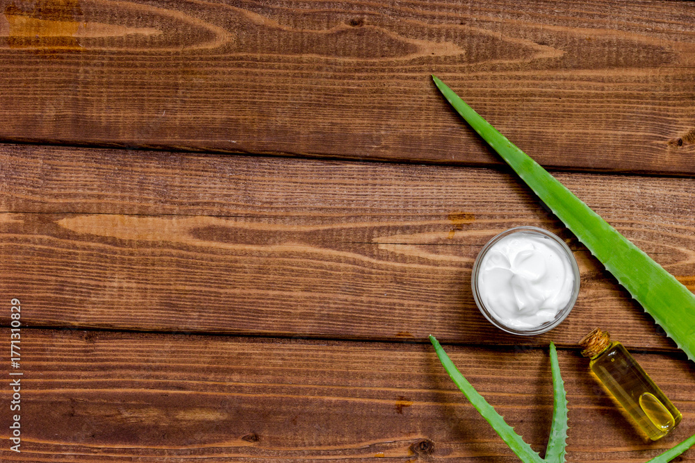 White beauty cream in jar with aloe vera wooden background