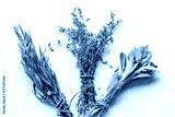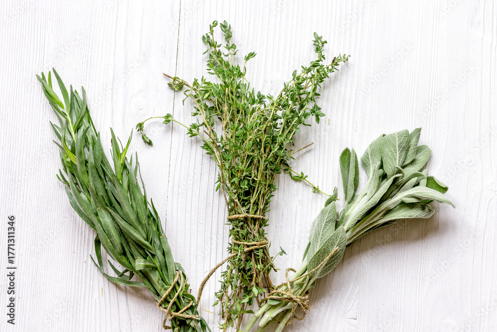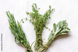 bundles of herbs on wooden background top view
