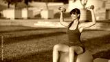 Woman training with dumbbells on fitness ball outdoors