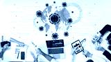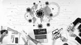 Team members engaged in a business meeting analyzing data with digital tools, emphasizing global connectivity and collaborative decision-making through technology. Trope