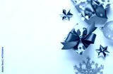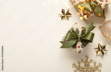 Merry Christmas and Happy Holidays greeting card, frame, banner. New Year. Christmas ornaments and gifts, presents on light beige background top view. Winter xmas holiday festive theme.