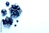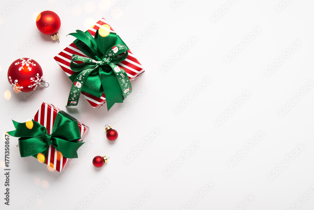 Merry Christmas and Happy Holidays greeting card, frame, banner. New Year. Red green Christmas decoration and gifts, presents on white background top view. Xmas holiday festive theme.