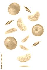 dynamic composition of fresh ripe mandarins or clementines, whole fruits and separated segments with green leaves, flying or falling, isolated photograph.