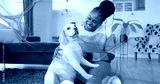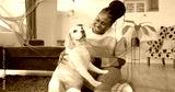 Kneeling woman wearing pastel sweater, petting white and tan dog on shag rug in living room