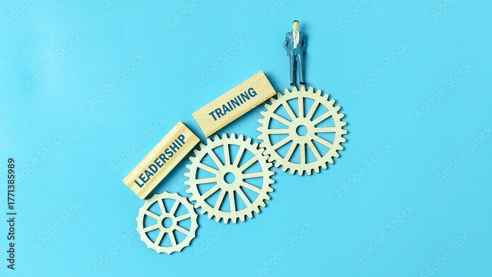 Miniature Businessman Figure Standing on Wooden Gears with Leadership and Training Blocks on Bright Blue Background