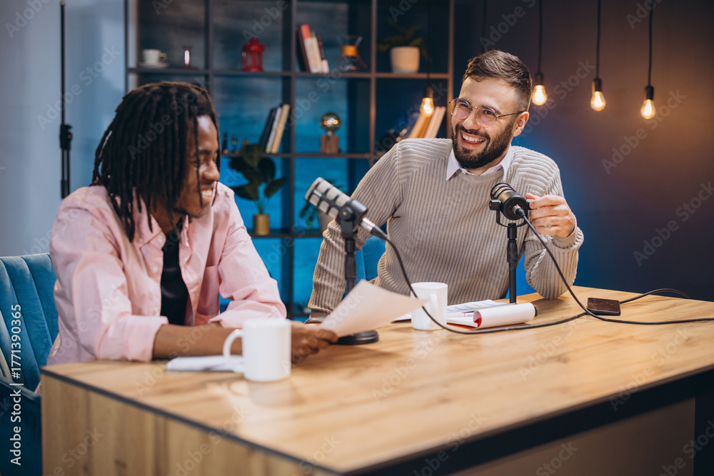 Two male podcasters are recording a new episode for their podcast in a professional studio, using microphones and reading from a script