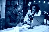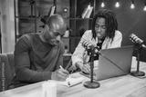 Two African American podcasters are working together in a professional studio, using a laptop and microphones to record their show