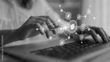 A person typing on a laptop with abstract digital icons representing connectivity and technology, illustrating the intersection of modern communication and innovation. Tessel