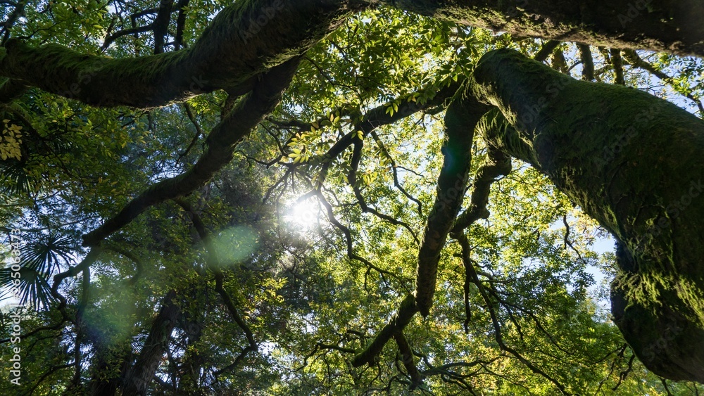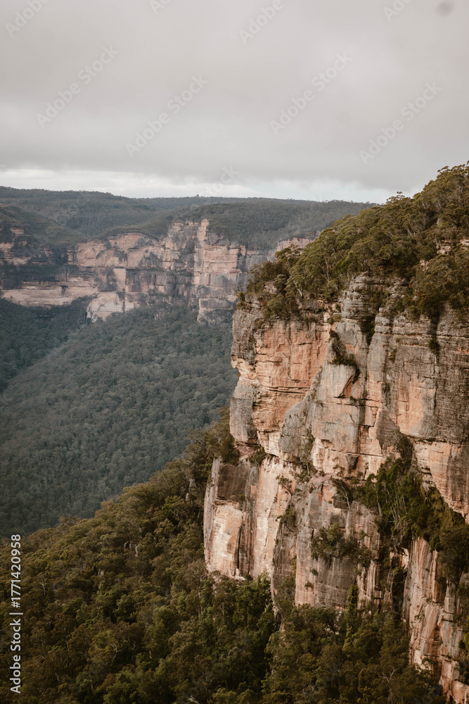 Vertical image of a panoramic foggy landscape of the stunning Blue Mountains covered with Tasmanian blue gum Eucalyptus trees outdoor at daytime during winter in Australia with space for text.