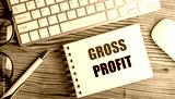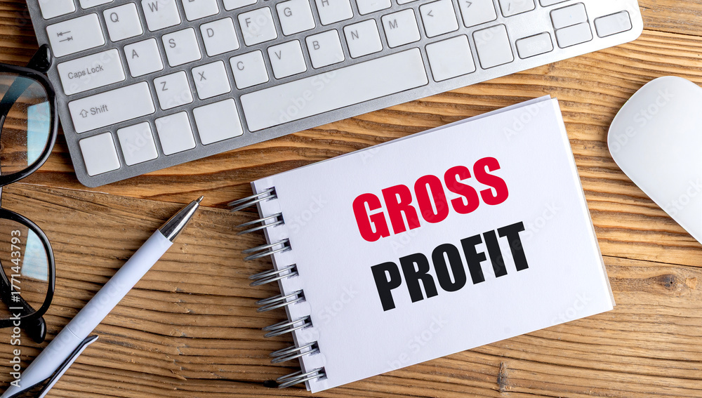 Gross profit message on spiral notebook with pen, keyboard and mouse on wooden desk