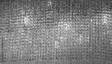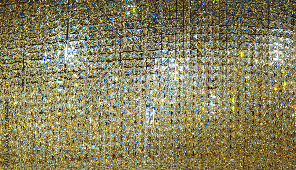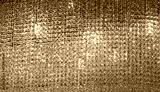 a shimmering, textured wall covered in numerous small, reflective, golden tinted glass beads. The beads are densely packed, creating a glittering, mosaic like effect