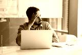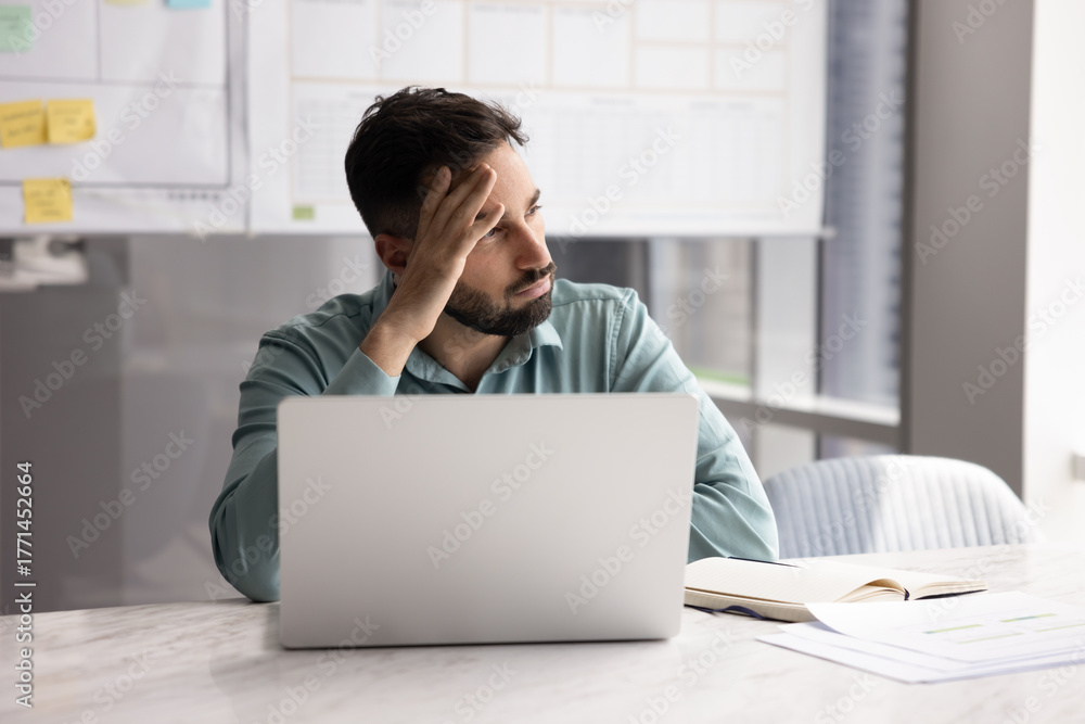 Pensive young businessman sitting at desk looking aside from notebook
