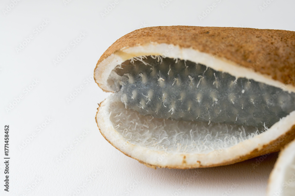 アケビの実を白い紙の上で室内撮影10