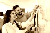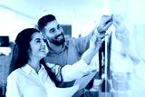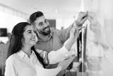 Two happy planners review project timeline on glass marker board