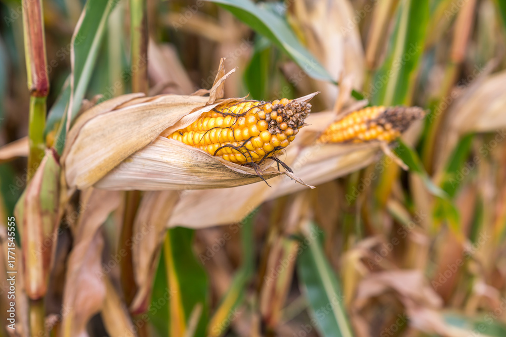 Close-up of ripe corn on the stalk with dried husks, surrounded by a field of corn plants