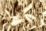 Close-up of ripe corn on the stalk with dried husks, surrounded by a field of corn plants