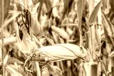 Close-up of ripe corn on the stalk with dried husks, surrounded by a field of corn plants