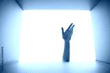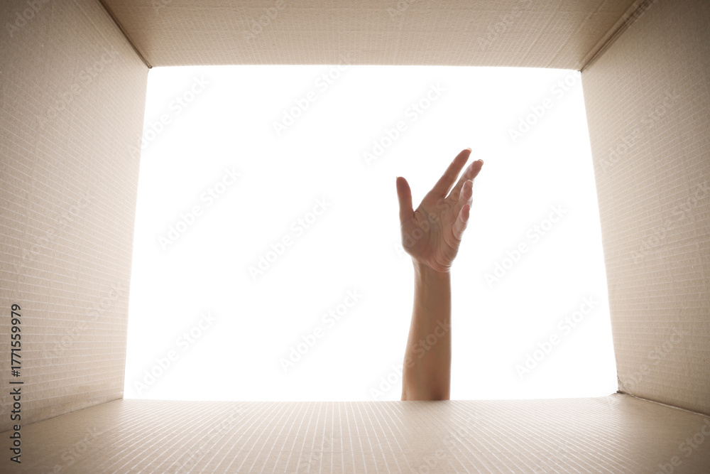 Woman reaching into cardboard box against white background, closeup. View from inside package