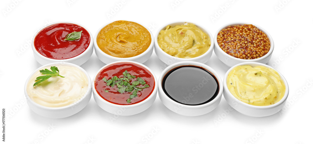 Different sauces and herbs isolated on white