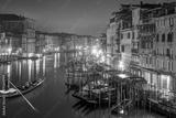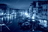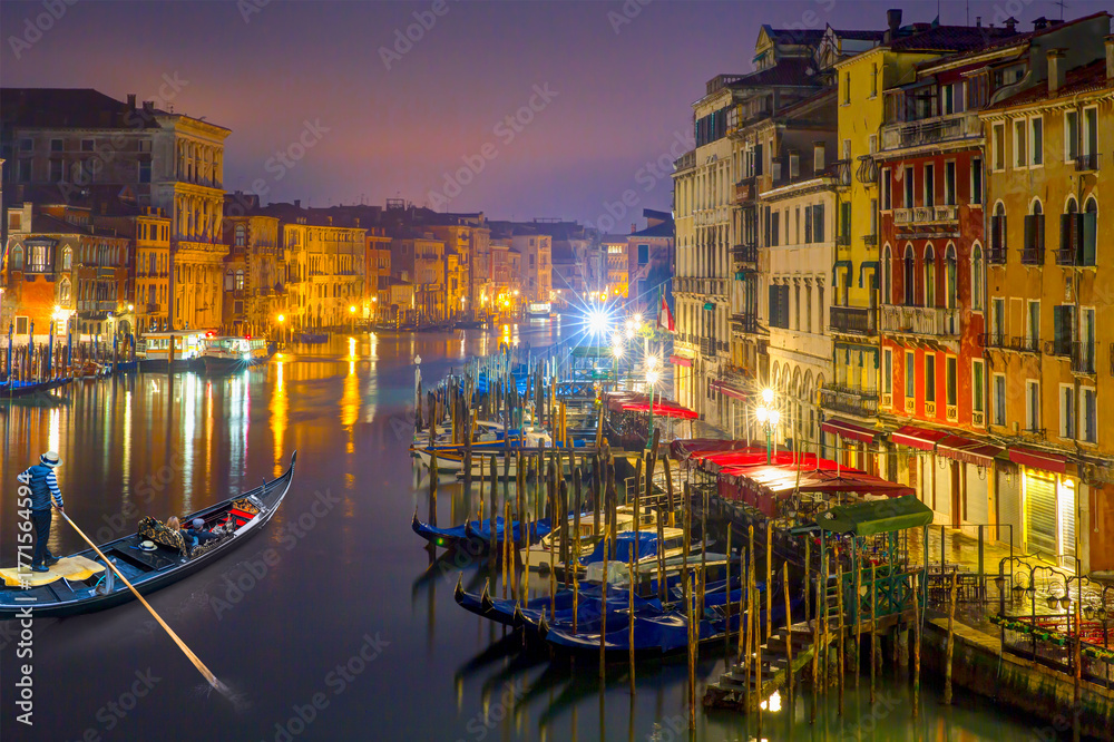 Gondola on Canal Grande in front of Rialto Bridge at dusk - Venice, Italy