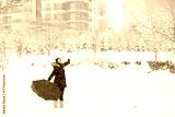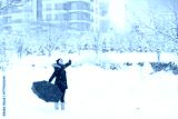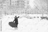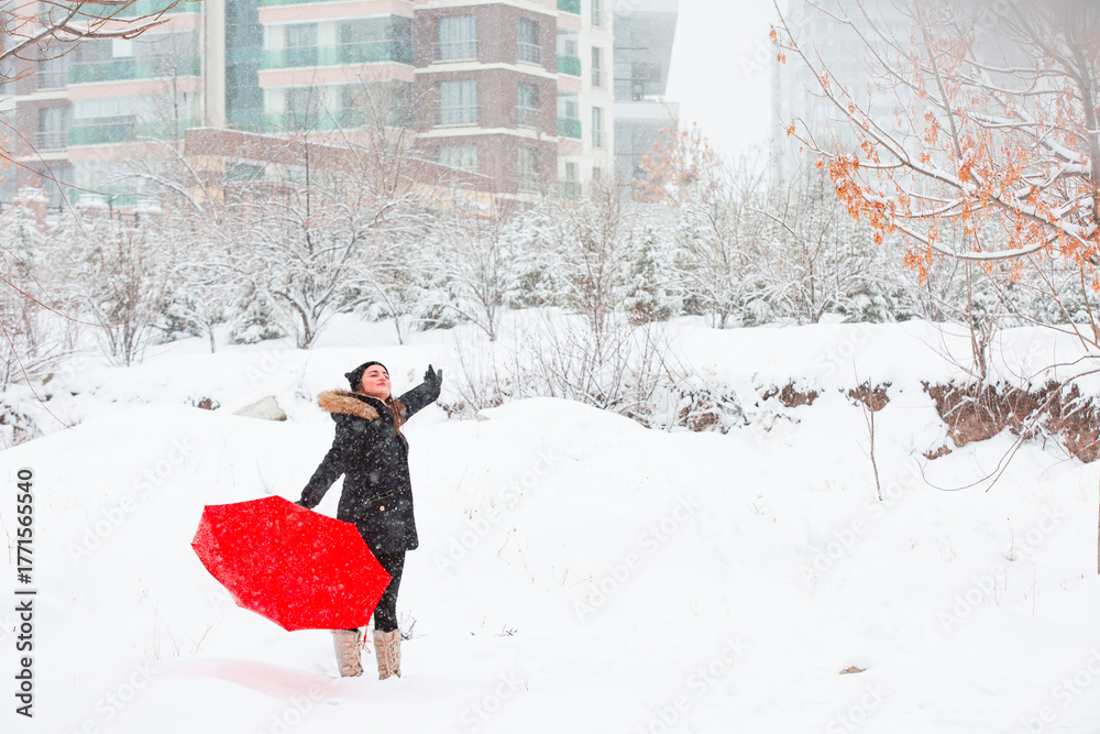 Beautiful girl in black coat with red umbrella walking down the road while snowfall