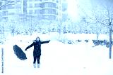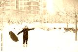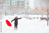 Beautiful girl in black coat with red umbrella walking down the road while snowfall