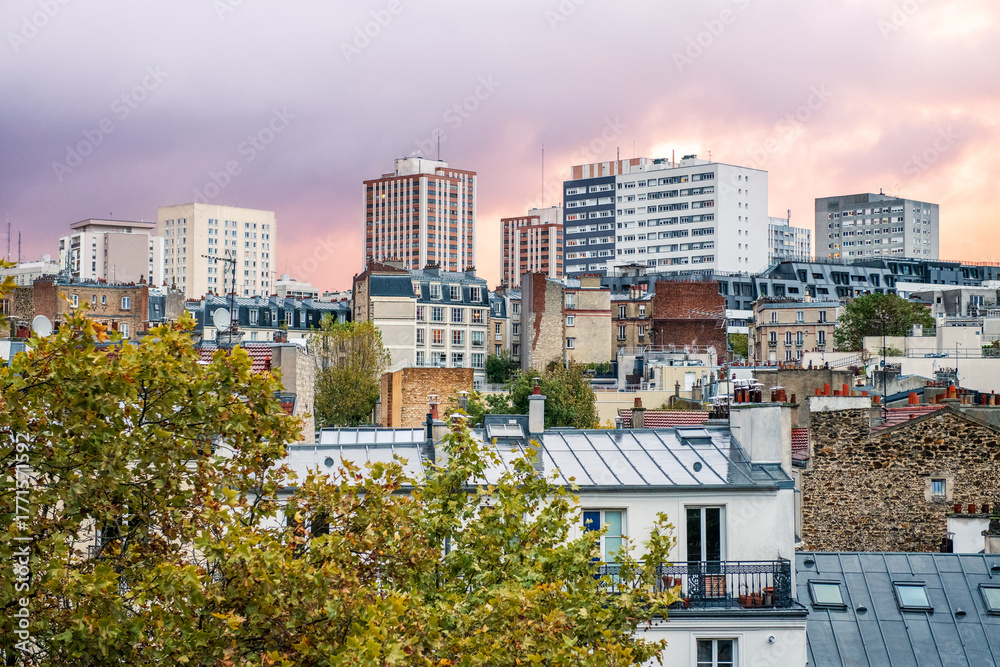 Urban landscape of Paris rooftops and buildings under a pastel sunset sky. Calm atmosphere with city textures and autumn colors.