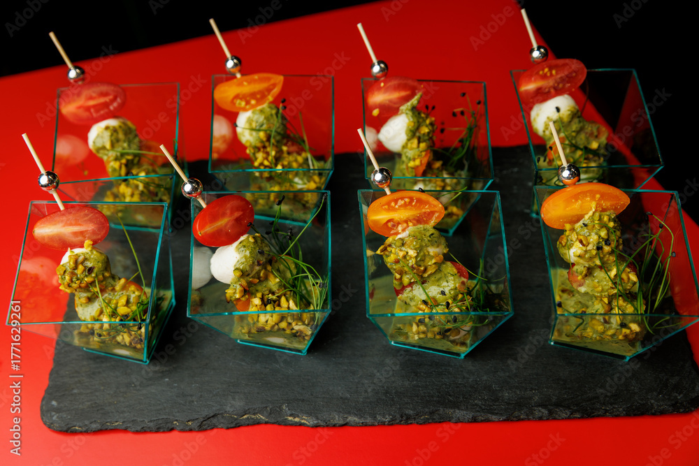 Caprese salad skewers with pesto and pistachio