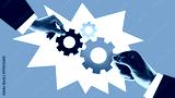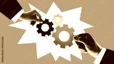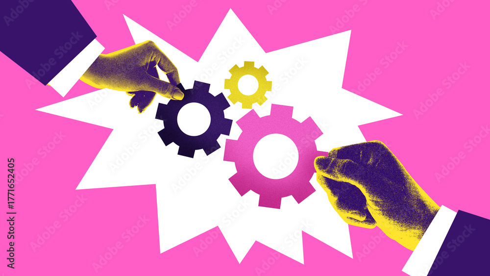 Modern collage. Hands assembling colorful gears on pink background with photocopy texture. Concept of startup innovation, SaaS integration, and efficient workflow in modern organizations.