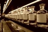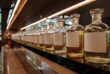 A low-angle, perspective shot of a long row of glass apothecary bottles filled with yellow perfume oils in a luxury fragrance shop. The bottles, which have blank white labels for custom blends.