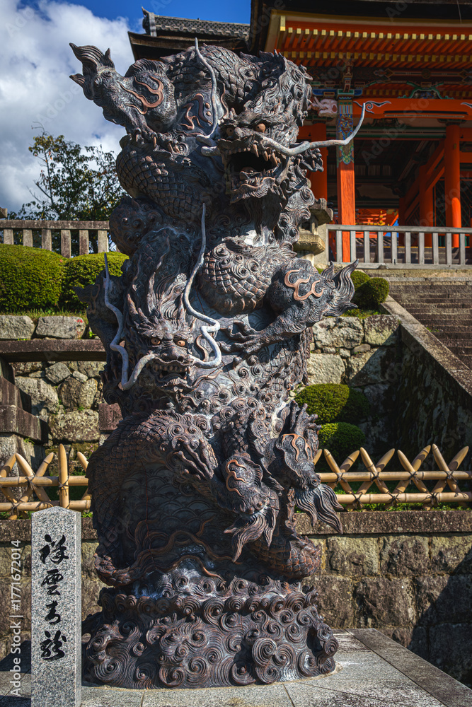 Kyoto, Japan - Oct 11 2024, Vertical close-up view of the stone statue of intertwined eastern dragons at the entrance to Kiyomizu-dera Temple, wirhout people, at daytime, Kyoto, Japan