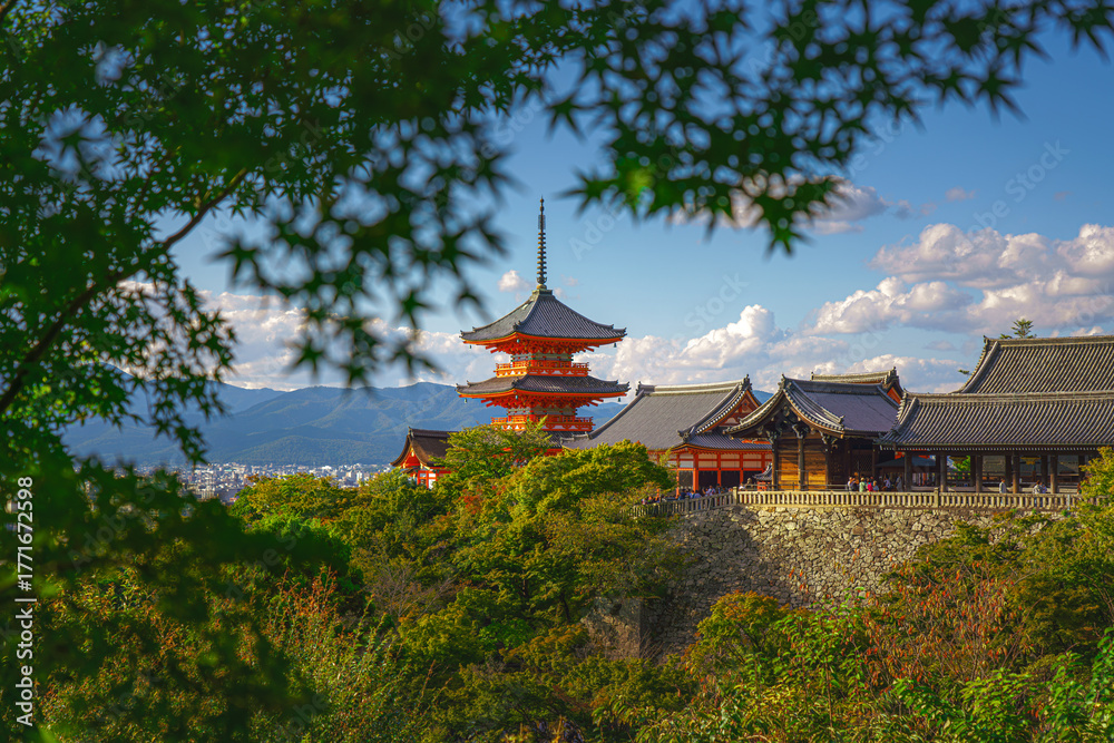 Kyoto, Japan - Oct 11 2024, panoramic view through foliage of Kiyomizu-Dera temple complex with a pagoda, without people, with a clear blue sky and a forest in foreground, at daytime, Kyoto, Japan