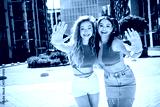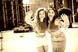 Sunny city adventure two best friends wave hello to the camera as stylish young girls explore urban streets in bright pink tops and denim shorts during a cheerful day out