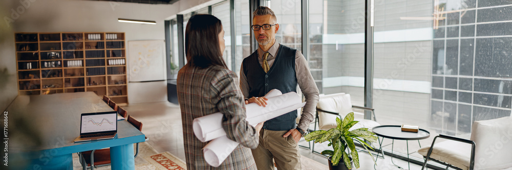 In a modern office, two skilled professionals collaborate on complex and detailed project blueprints