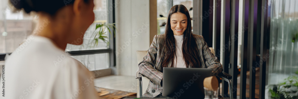 In a trendy cafe, two women engage in a lively discussion about ideas while using laptops and tablets to work