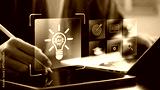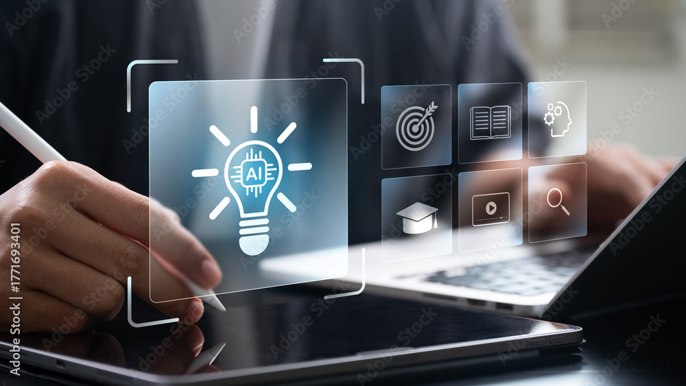Smart education technology with AI powered idea creation, interactive learning icons, and digital knowledge tools used on tablet for personalized study and future ready training experience