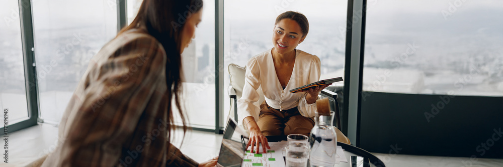 In a modern office with a city view, two professionals engage in a deep discussion about innovative strategies