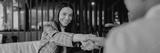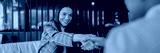 A professional woman in a stylish blazer confidently shaking hands within a contemporary corporate office environment