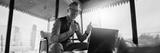 A cheerful businessman happily communicates through his laptop in a modern and stylish workspace environment