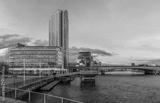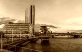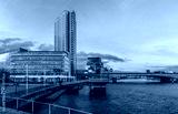 Belfast evening skyline with tall buildings and a dramatic sky over the River Lagan, viewed from the historic Lagan Weir Bridge in Northern Ireland.
