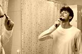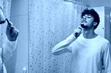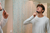 attractive young man shaving beard with electric shaver while looking at mirror in bathroom