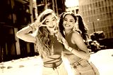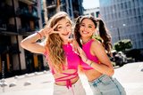 Bright city day best friends pose in pink crop tops smiling and posing for a sunny urban fashion moment