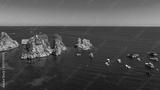 Aerial view of the Faraglioni rocks located in the Bay of Scopello, in the province of Trapani, Sicily, Italy. There are boats on holiday among the cliffs.