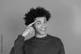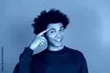Young man with curly hair in a red sweater smiles and points to his temple against a teal blue background