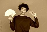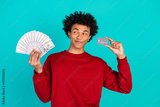 Young man holding cash and credit card smiles while posing for a fashion lifestyle stock photo against a teal blue background