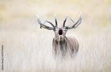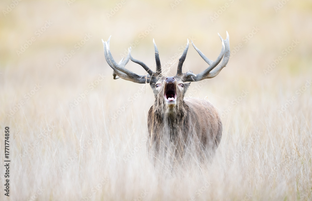 Portrait of a red deer stag roaring during rutting season in autumn