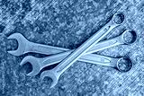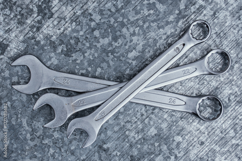 Close-up of shiny chrome wrenches arranged on a galvanized steel surface. Concept precision, craftsmanship, and mechanical repair or maintenance.